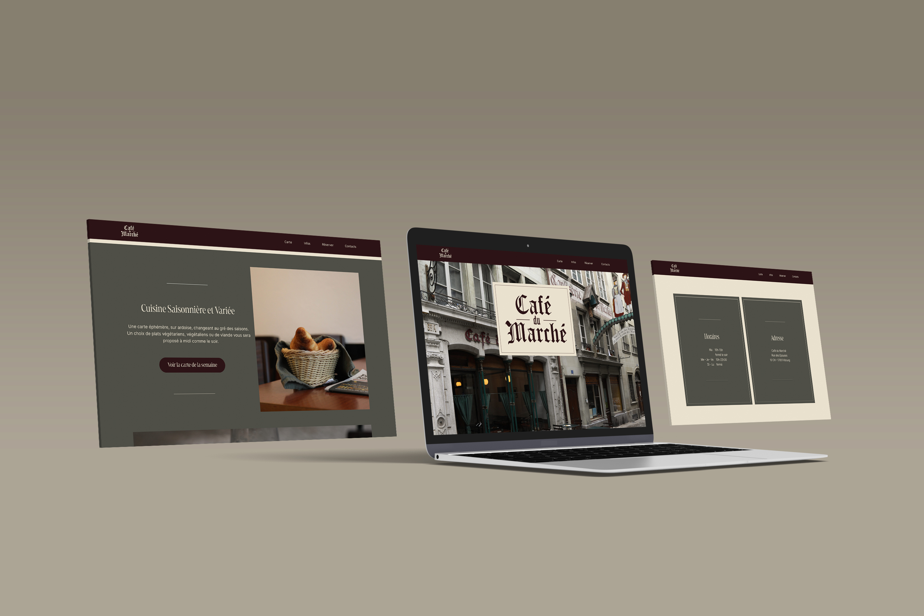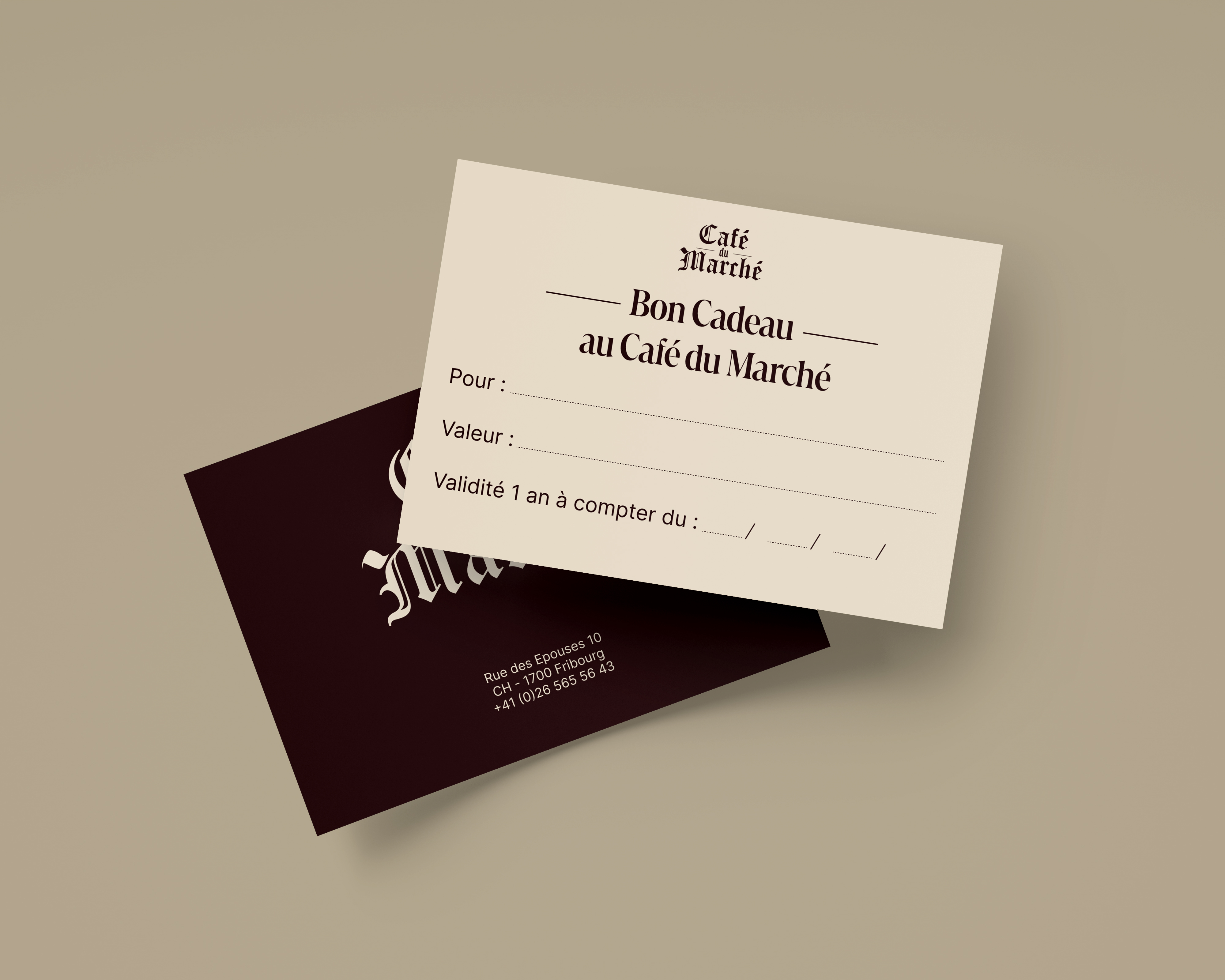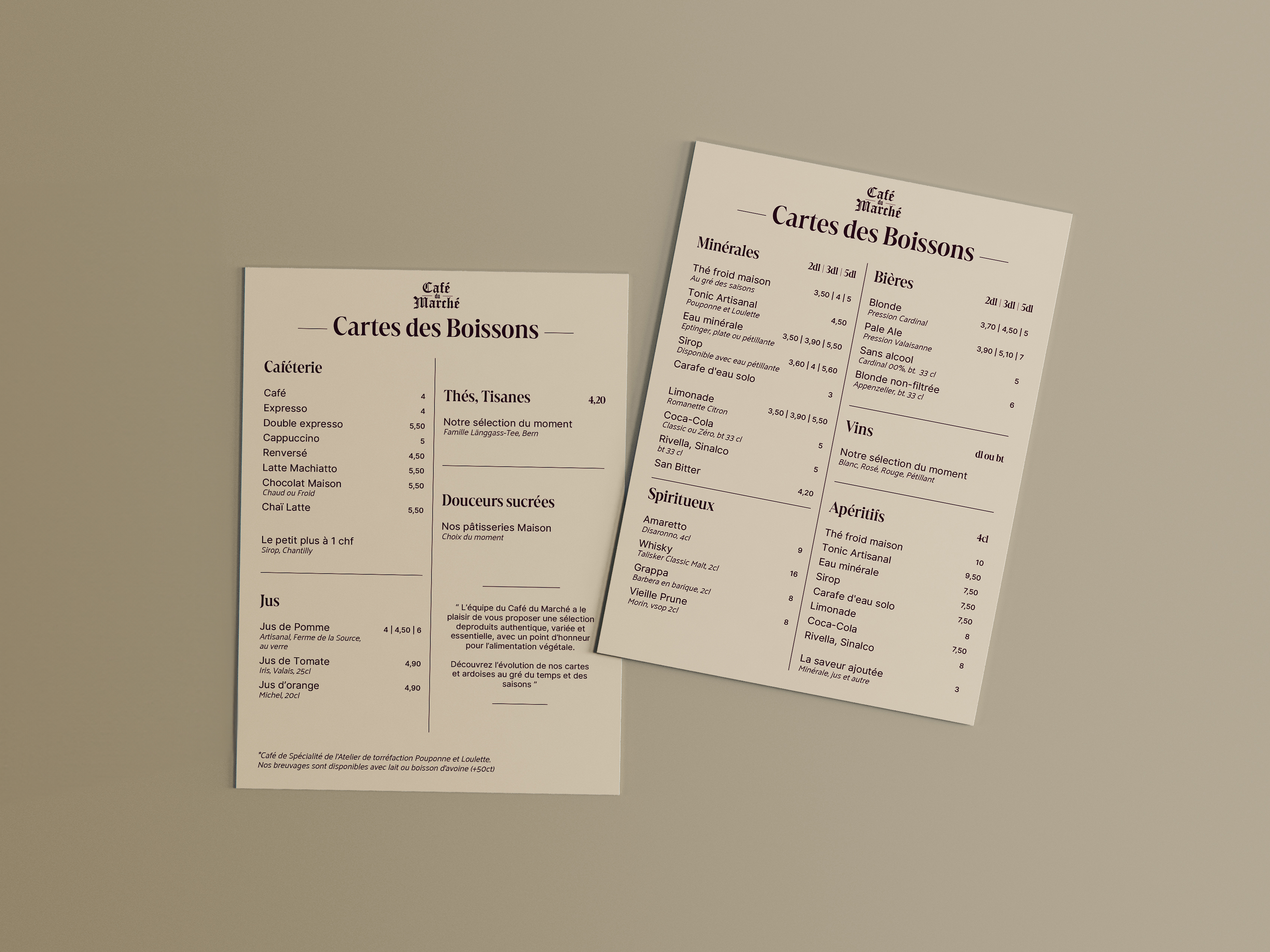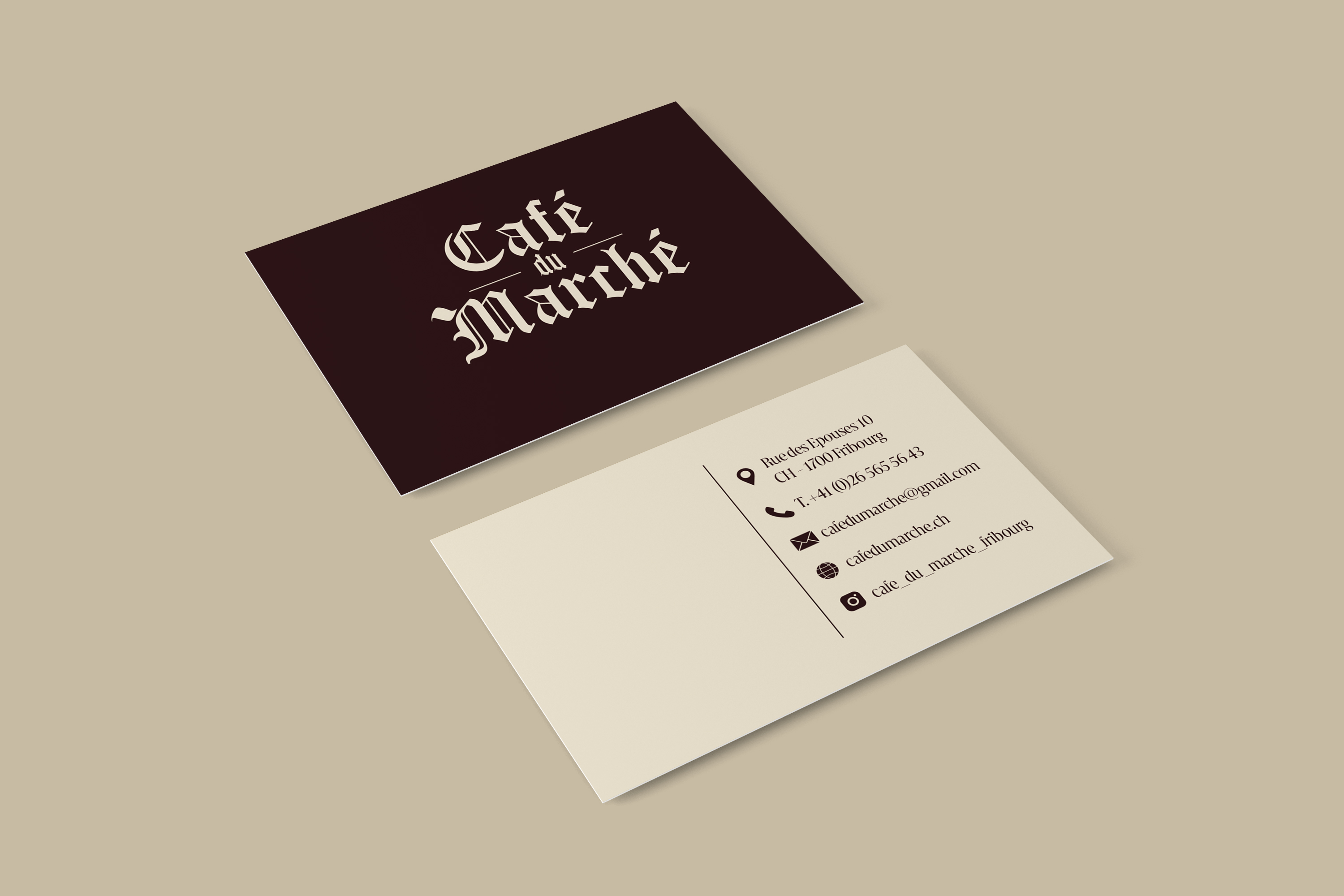 Café du Marché est un projet que j'ai réalisé durant mon stage chez RMG Design à Fribourg. Le projet consistait à créer l'identité visuelle de l'établissement, ce qui incluait la conception d'un logo, la réalisation d'un site web one-page, ainsi que la création de divers supports de communication tels que des cartes de visite et la carte des boissons.