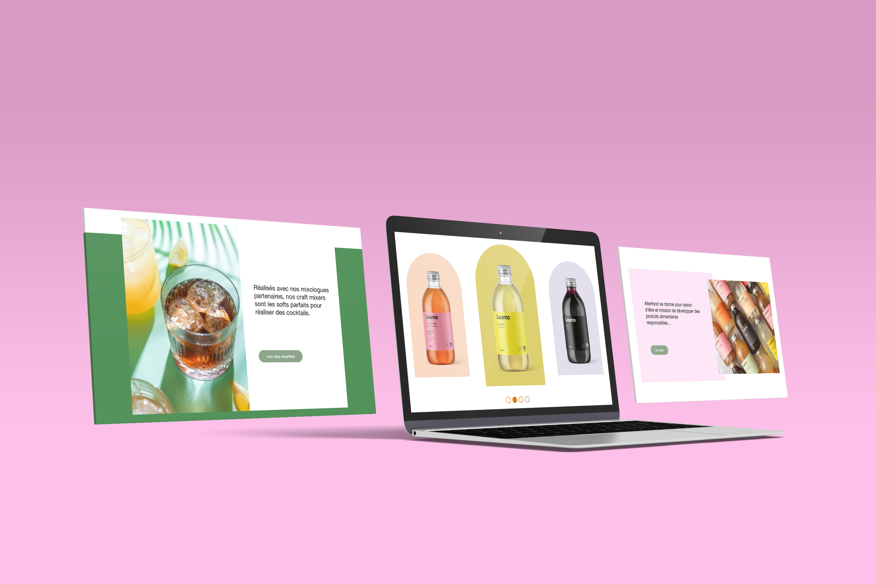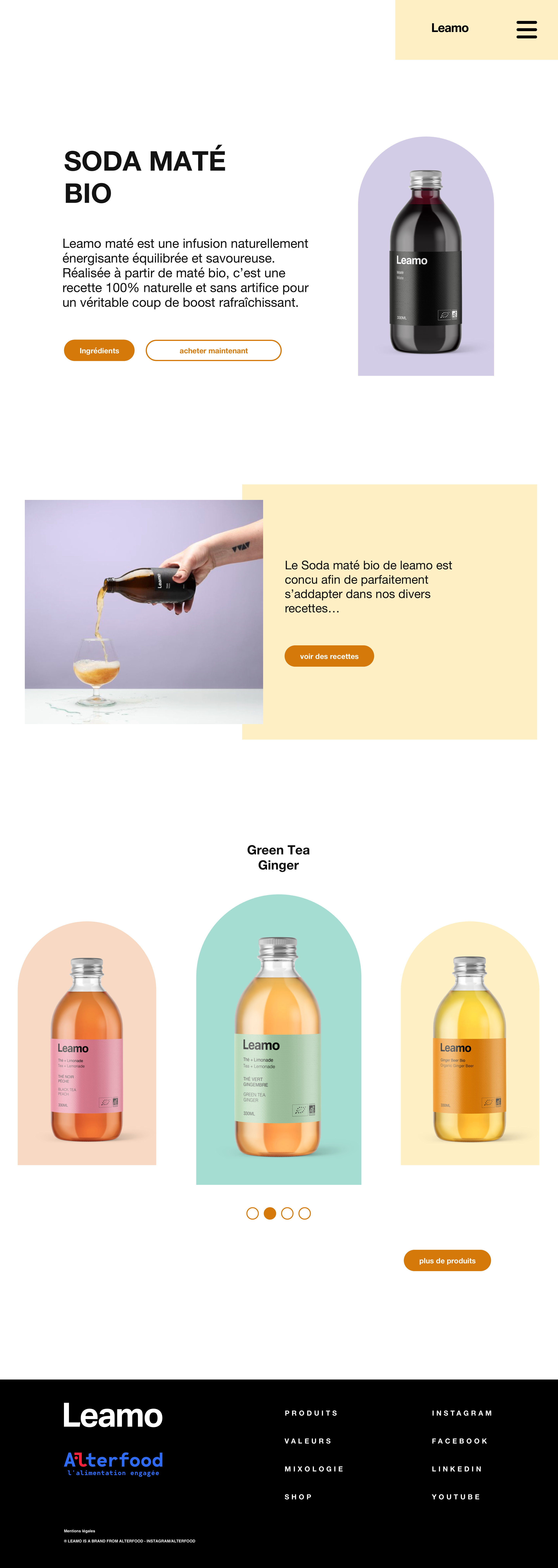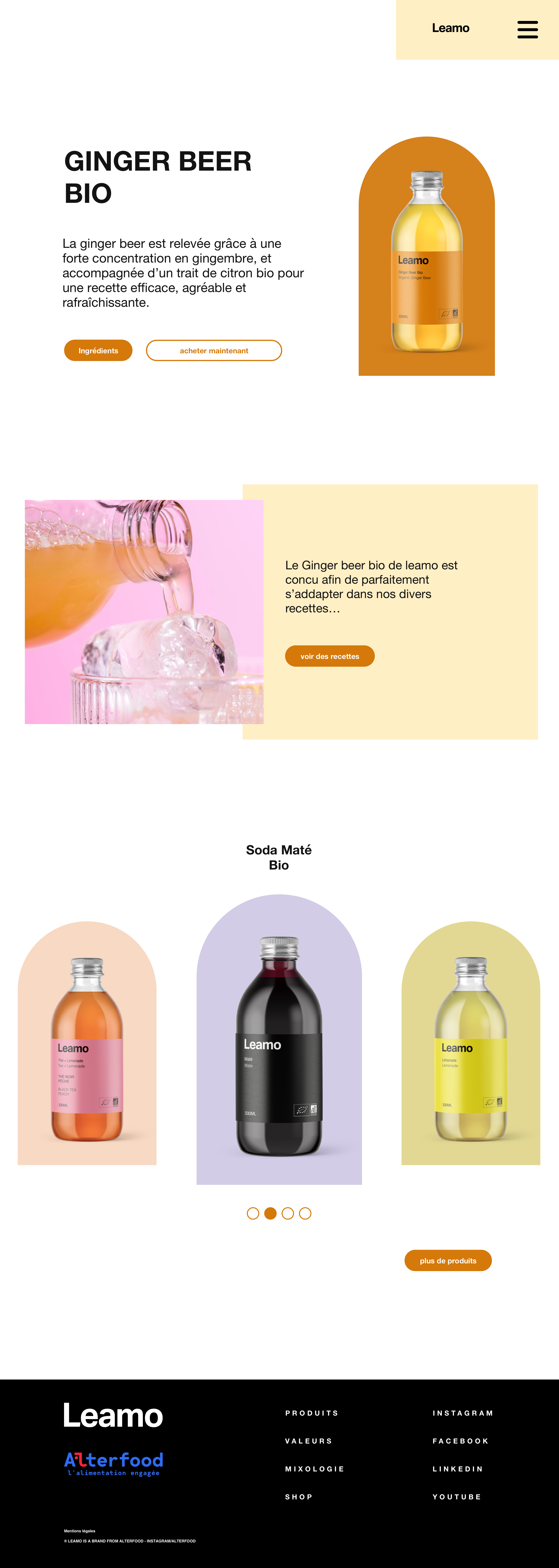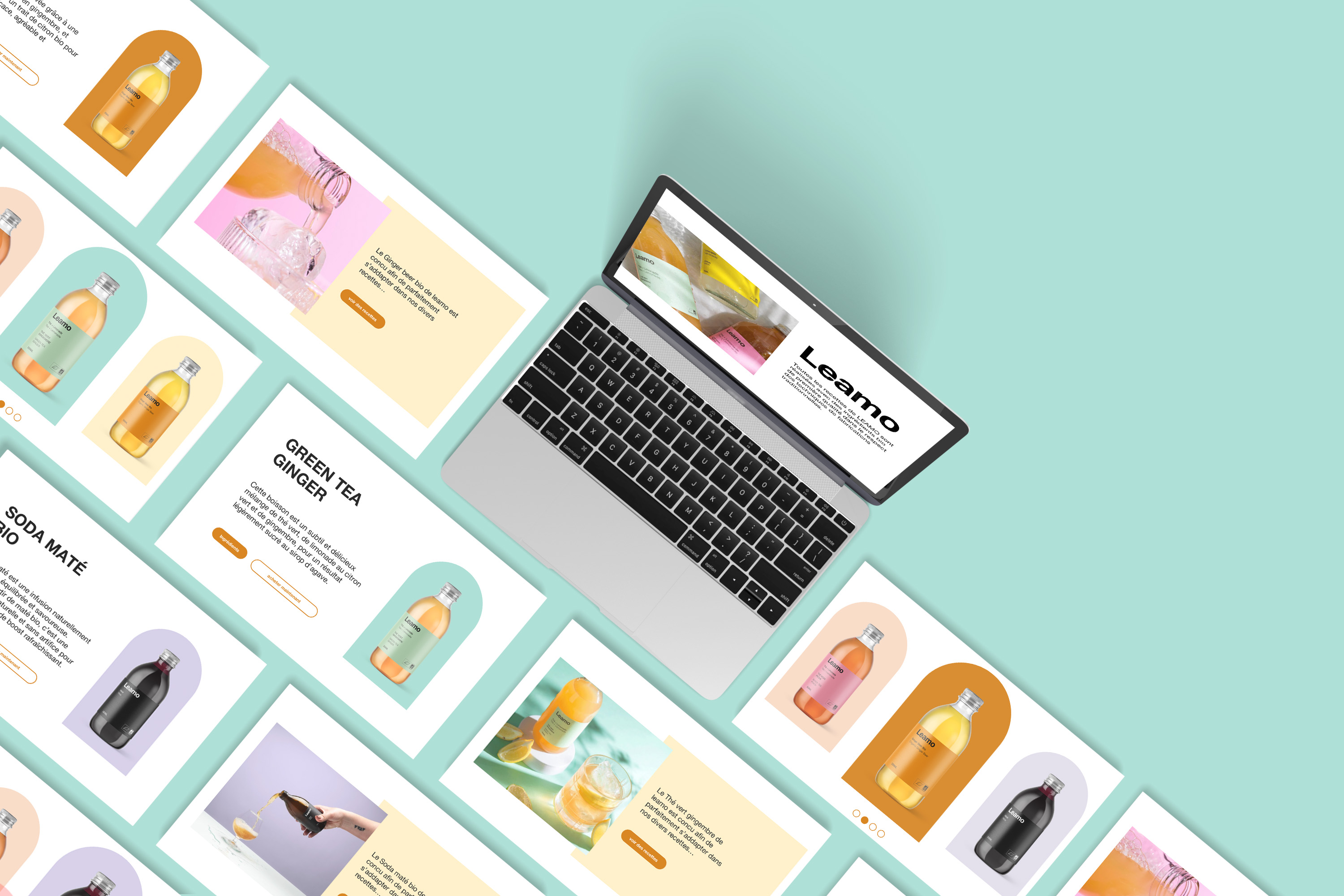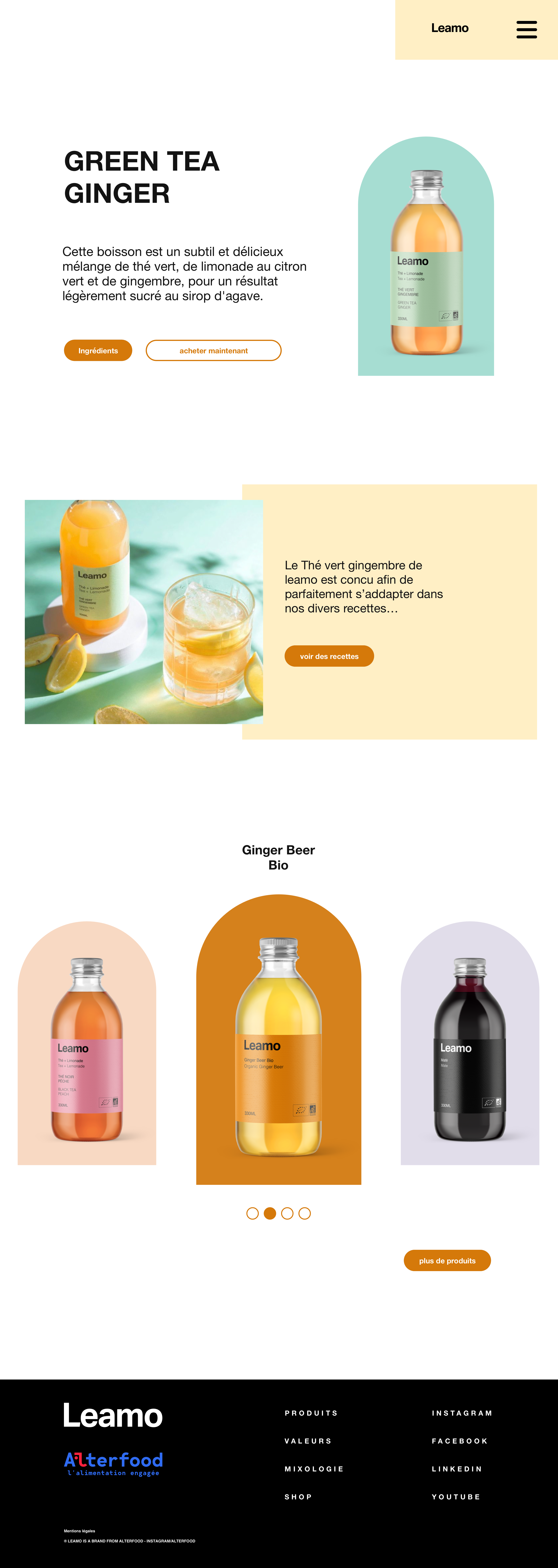 Leamo est un projet fictif mené durant ma deuxième année de formation à eikon dans le cadre du cours de UI Design. Le projet impliquait la création du design d'un site web pour la marque de boissons Leamo. Nous devions élaborer la page d'accueil, la page dédiée à un produit, ainsi que ses déclinaisons pour deux autres produits.